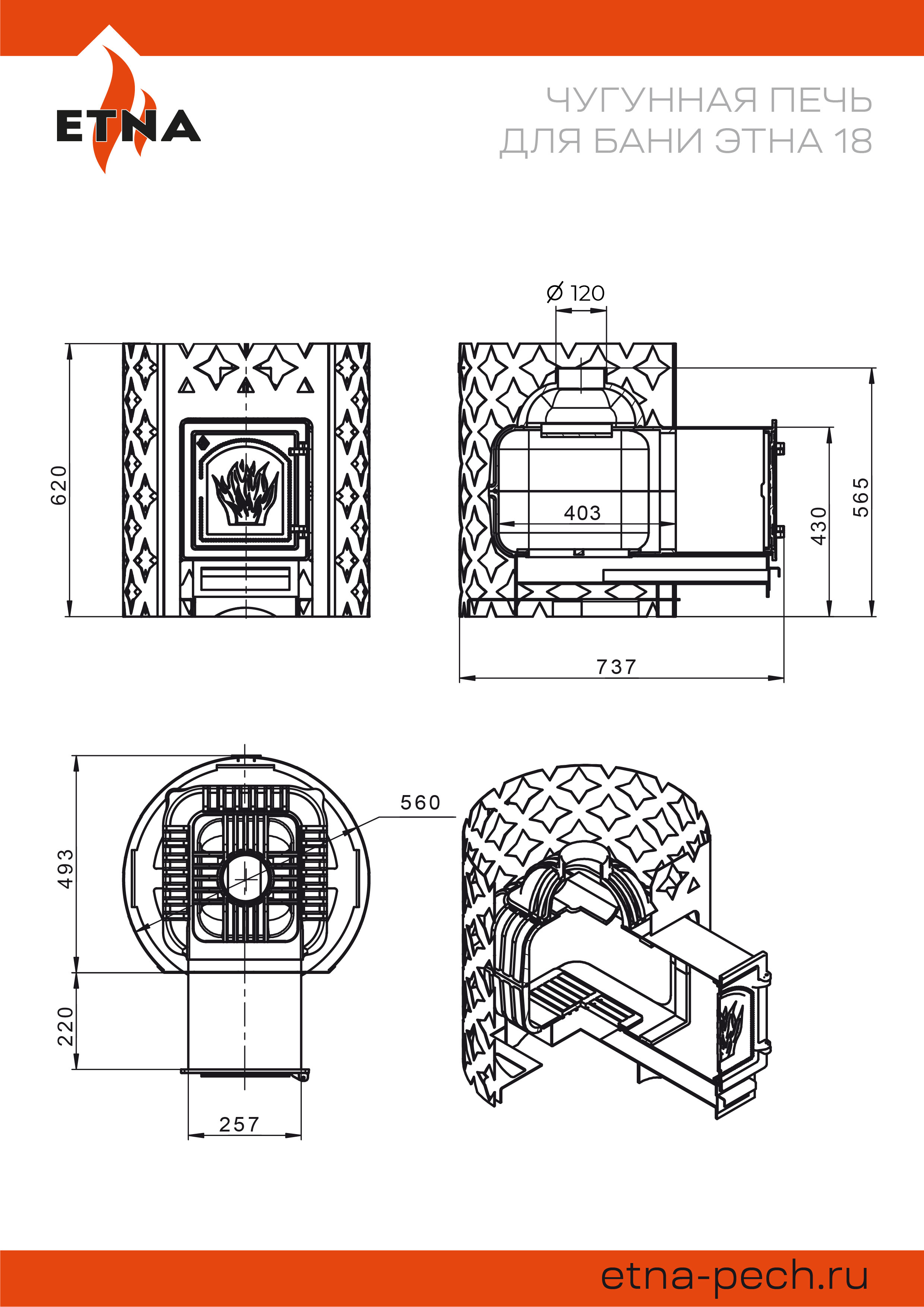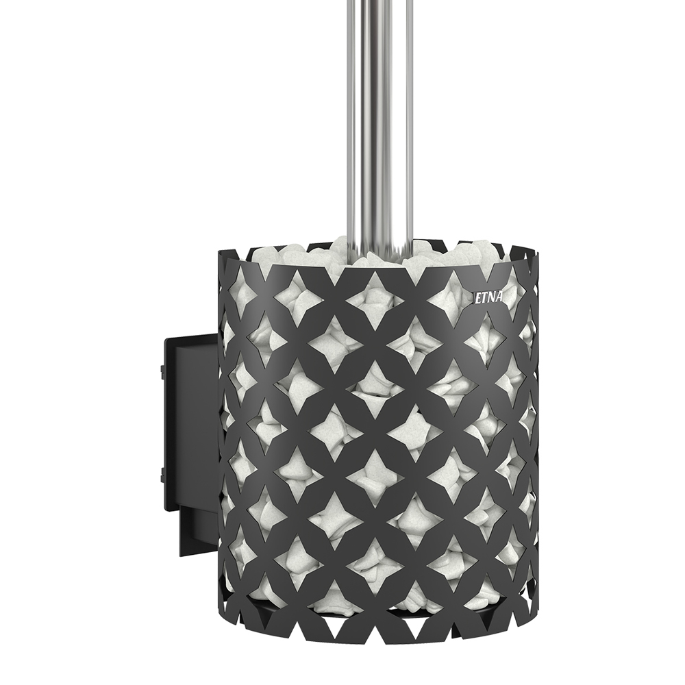 Чугунная банная печь ЭТНА 18 (ДТ-4) рассчитана на работу в парной объёмом до 18 м3. Цельно литая чугунная дверца сохраняет свою форму при нагревании. Крепление дверок к топочному тоннелю – болтовое, позволяет снимать и заменять дверку. Для устройства наружной открытой каменки печь ЭТНА 18 оснащается металлическим кожухом с прорезным рисунком оригинального дизайна. Пространство между печью и кожухом из двухмиллиметровой стали заполняется камнями для бани, которые выполняют роль теплонакопителя и защищают парящихся от жёсткого инфракрасного излучения. Кожух диаметром 560 миллиметров вмещает в себя до 120 килограммов камней крупной и средней фракции.