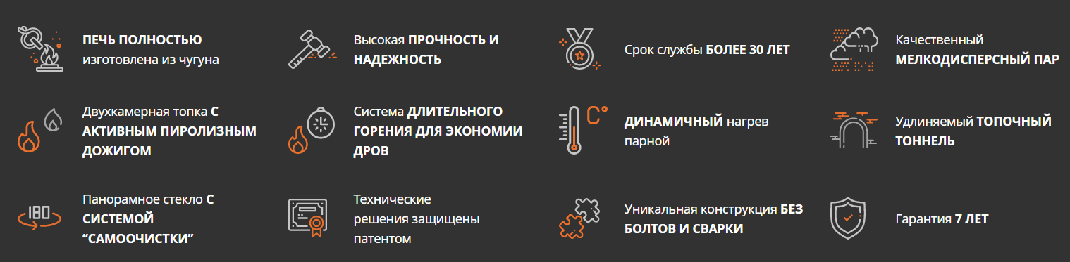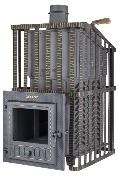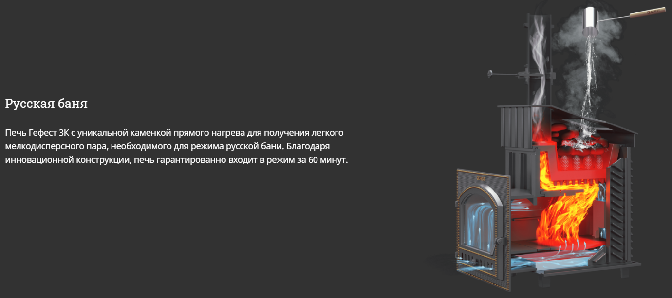 Чугунные банные печи ГЕФЕСТ ЗК изготовлены из чугуна с толщиной деталей до 40 мм. Каменка ЗК усиленная каменка большей массы, с единым углублением внутрь топки для дополнительной укладки чугунного заряда. Теплосъемные шипы, со стороны горения пламени, в разы увеличивают площадь соприкосновения огня с каменкой и ускоряют передачу тепла, а также способствуют лучшему дожигу смешивая потоки пламени и воздуха поступаемого из воздушника. Эти усовершенствования значительно повышают мощность парообразования печи и выдают большее количество пара при непрерывной подаче воды. Каменка печей Технолит-ЗК является незаливаемой. В печах серии «Технолит» реализован вторичный дожиг пиролизных газов, боковые и тыльная стенки оснащены конвекционными рёбрами. Регулируемая длина топочного тоннеля избавит от проблем при прохождении стены любой толщины. При сборке печи не используются сварные швы и болтовые соединения. Срок службы печей более 30 лет.