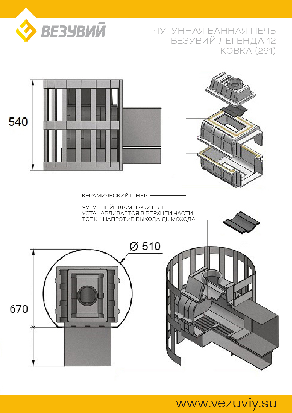 Печи для бани Везувий являются лидерами продаж среди чугунных печей для бани. Конструкция печи проста и надежна. Чугунная топка печи Везувий Легенда состоит из трех элементов, для герметичности в конструкции используется керамический термостойкий шнур.