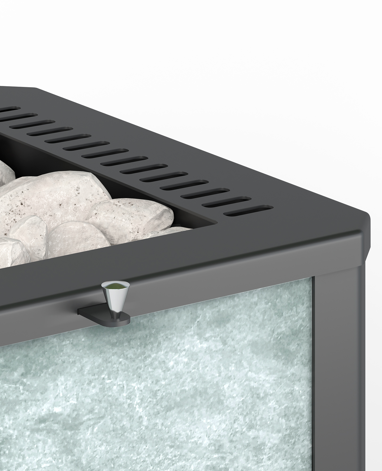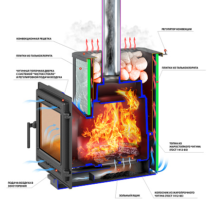Конвекционно–вентилируемая облицовка, изготовленная из экологически чистой горной породы , который обладает большой теплоёмкостью, что позволяет камню в короткие сроки нагреваться и максимально долго удерживать стабильную температуру в парильном помещении, а также гасить жёсткое инфракрасное излучение Камень обладает исключительными лечебными свойствами: помогает при головных болях, при нестабильном артериальном давлении, при простудных заболеваниях, воспалительных процессах в почках и пищеварительной системе, снимает повышенную возбудимость и нервозность, сглаживает эмоциональные всплески. Облицовка из натурального камня при нагреве способна аккумулировать тепло, что гарантирует максимально равномерный прогрев и сохранение тепла Банная печь Легенда 28 Панорама "М" талькохлорит укомплектован чугунной каминной, самоохлаждаемой дверцей Везувий 505 с большим жаропрочным стеклом «SCHOTT ROBAX», с оборудованной системой самоочистки, что позволяет визуально контролировать горение и любоваться видом живого огня. Данная печь рассчитана на объем парильного помещения 14-30 м3.Дымоход и комплектующие