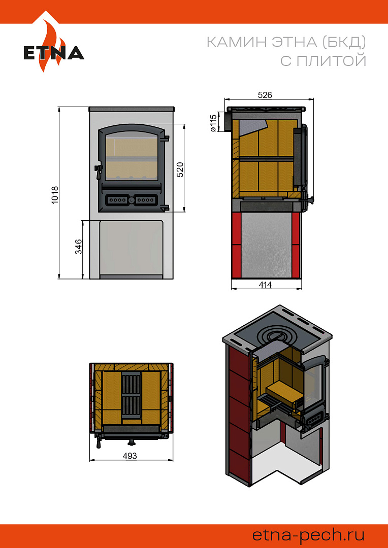 Печь-камин ЭТНА предназначена для обогрева помещений объемом от 50 до 180 м3 за счёт горения твёрдого топлива (дрова, топливные брикеты).