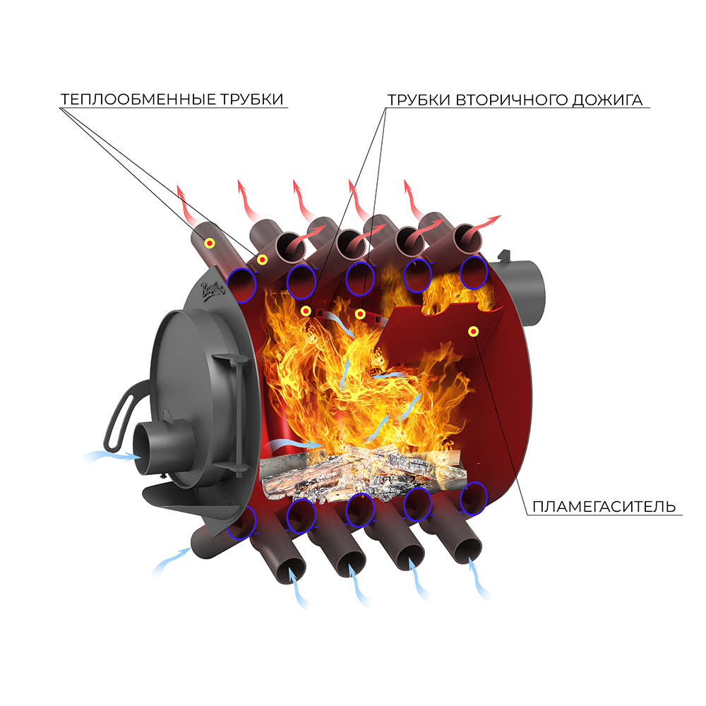 АОГТ представляет собой тепловой агрегат конвекционного типа с КПД 75-80% и системой длительного горения топлива. Сварная конструкция из особо прочной котловой стали 09Г2С и рассчитана на долговременную эксплуатацию. Две камеры сгорания, нижняя камера газификации и верхняя камера дожига газов, обеспечивают практически полное сгорание топлива и получение максимального количества энергии во время работы печи.