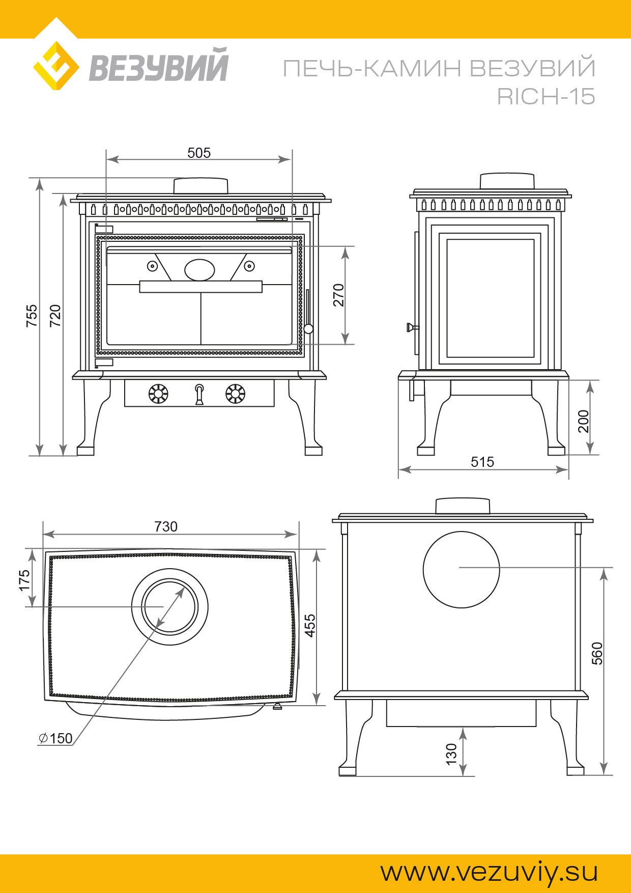 Печь-камин Везувий RICH-15 изготовлена из качественного жаростойкого чугуна с толщиной стенок 6-8 мм.