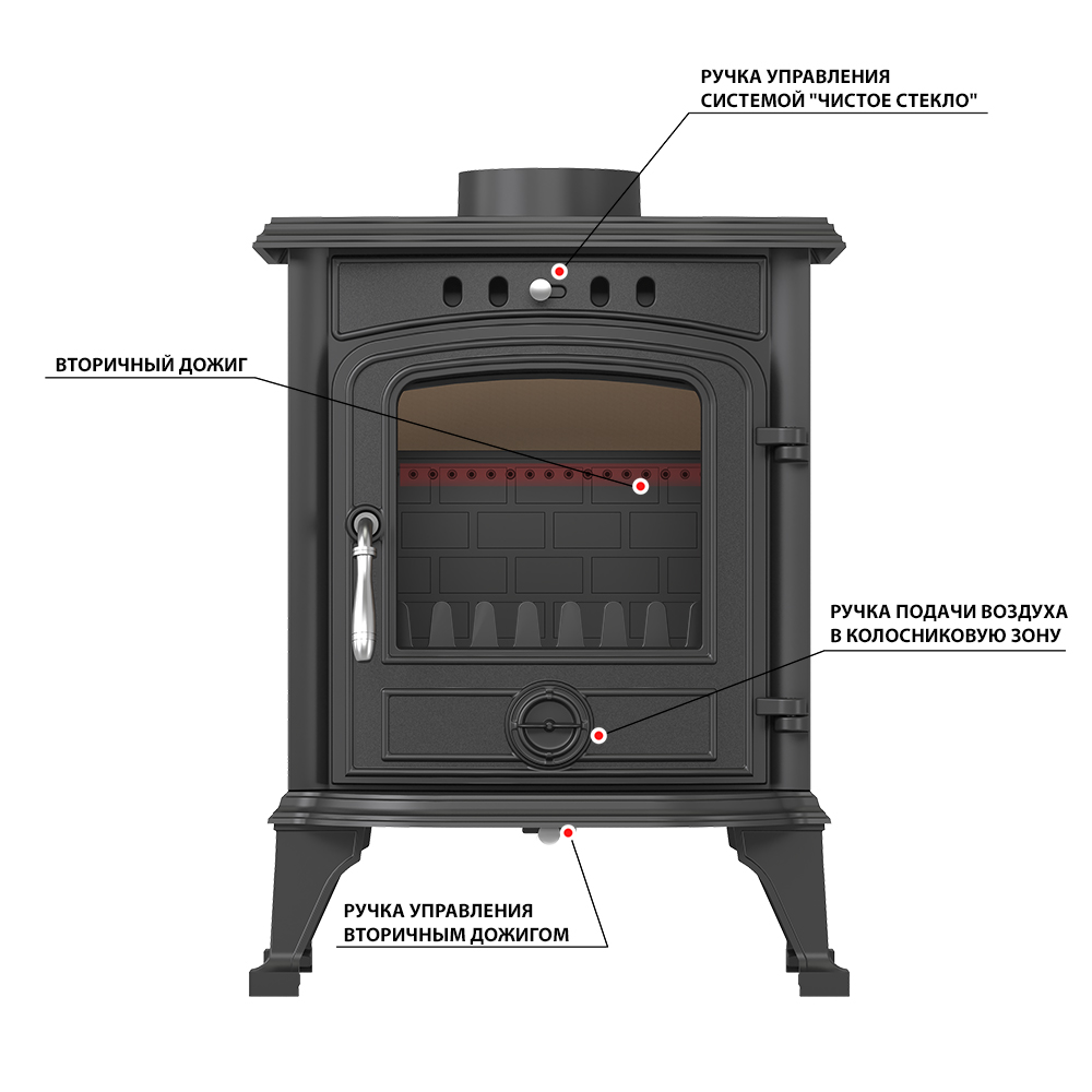 Боковые стенки и дно топки усилены вермикулитовыми плитами , задняя двойная чугунная стенка с системой вторичного дожига. С помощью этой функции по каналам подачи вторичного воздуха поступает кислород, который нагревается при прохождении между топочной камерой и стенками корпуса. Далее нагретый воздух через дефлектор поступает в топку, перемешивается с газами - продуктами горения, чем вызывает повторное возгорание. Регулировка этой системы осуществляется рычагом, расположенным в нижней части печи-камина.