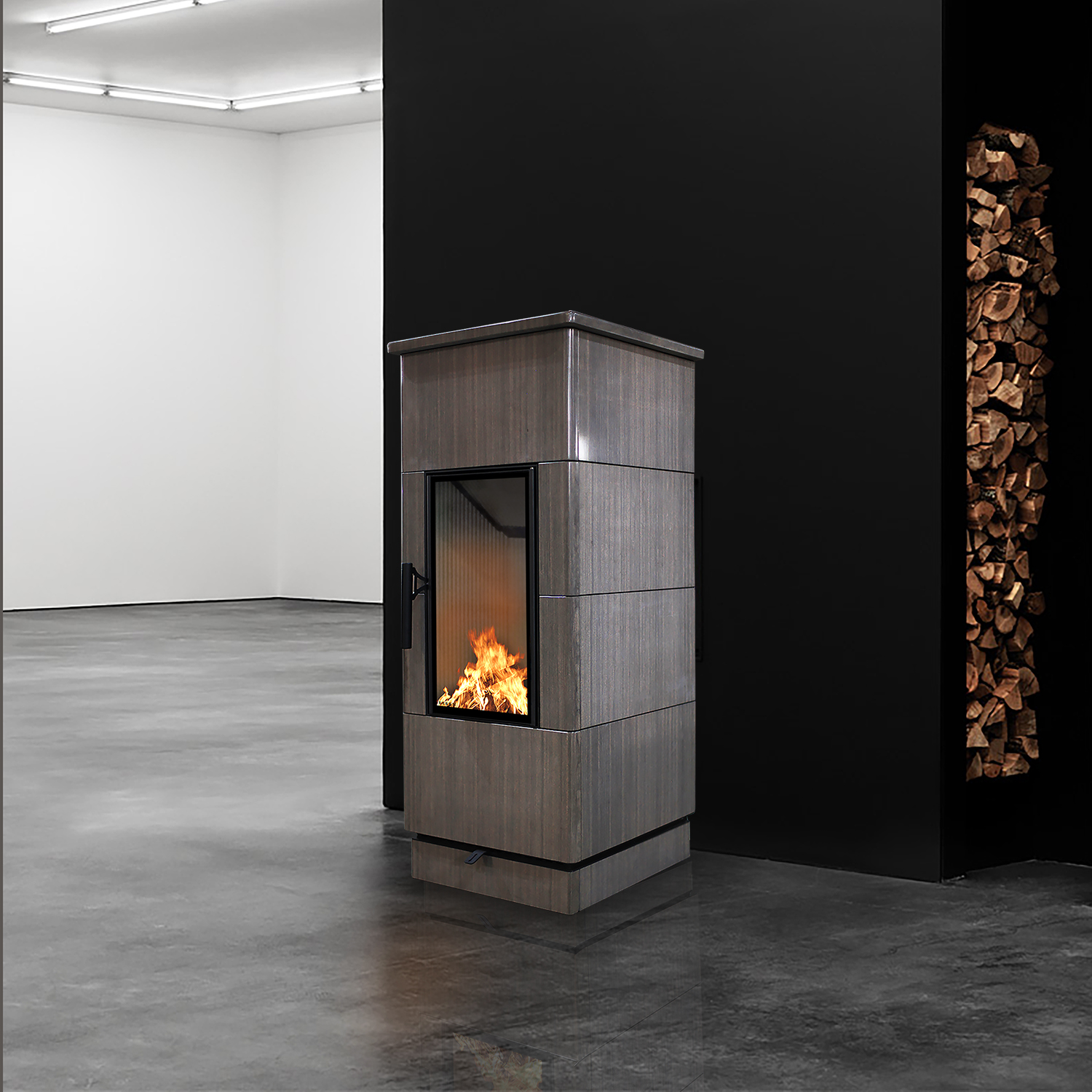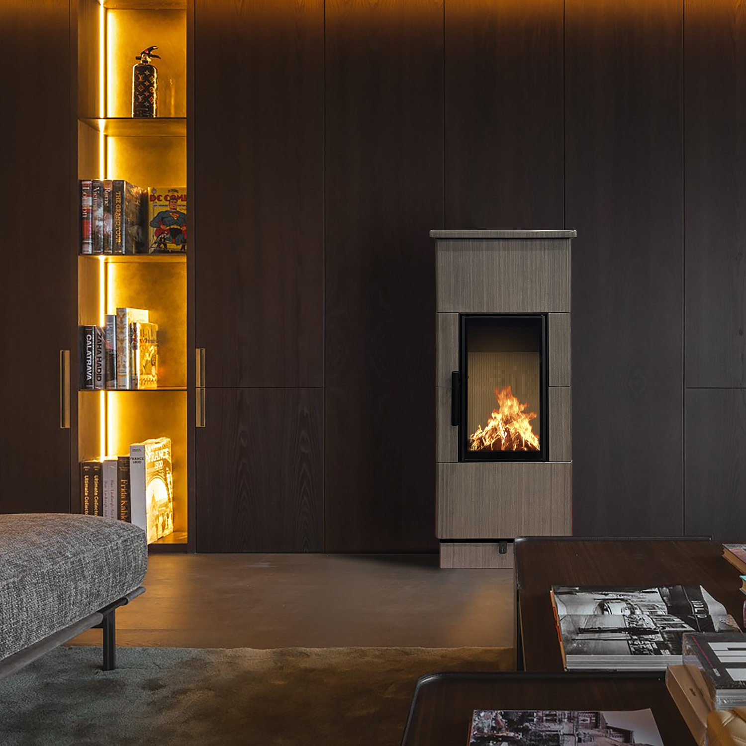 За счёт внешней облицовки из натурального камня — песчаника, печь-камин Tabaco Grey обладает высокими показателями накопления тепла и его последующей длительной передаче дому.