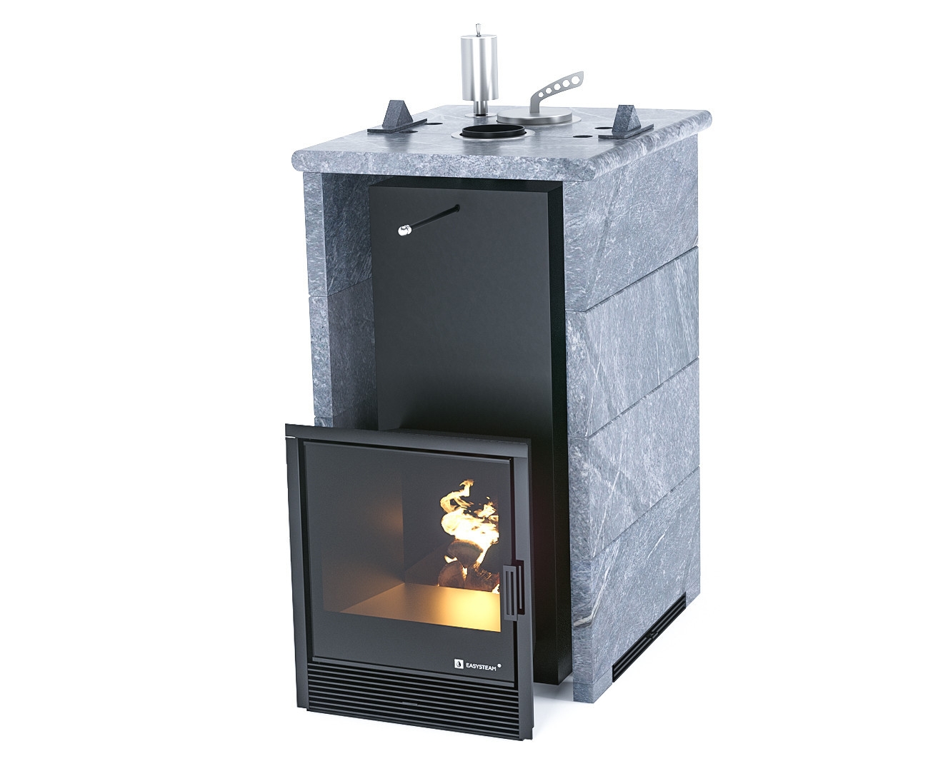 Печь для бани ИзиСтим Сочи в трехстороннем кожухе предназначенная для использования в небольшой семейной бане с объемом парной не более 22 м3. Закрытая каменка и встроенный парогенератор гарантирует большое количество легкого пара. На печи есть терморегулирующая задвижка, которая позволяет максимально рационально использовать тепловую энергию печи в двух режимах: интенсивный прогрев парной и каменки, или интенсивный прогрев каменки. Кожух из природного камня, создаст приятную атмосферу в парной, излучая мягкое тепло. Панорамная дверка размером стекла 370*370 мм позволит наблюдать за огнем из комнаты отдыха.