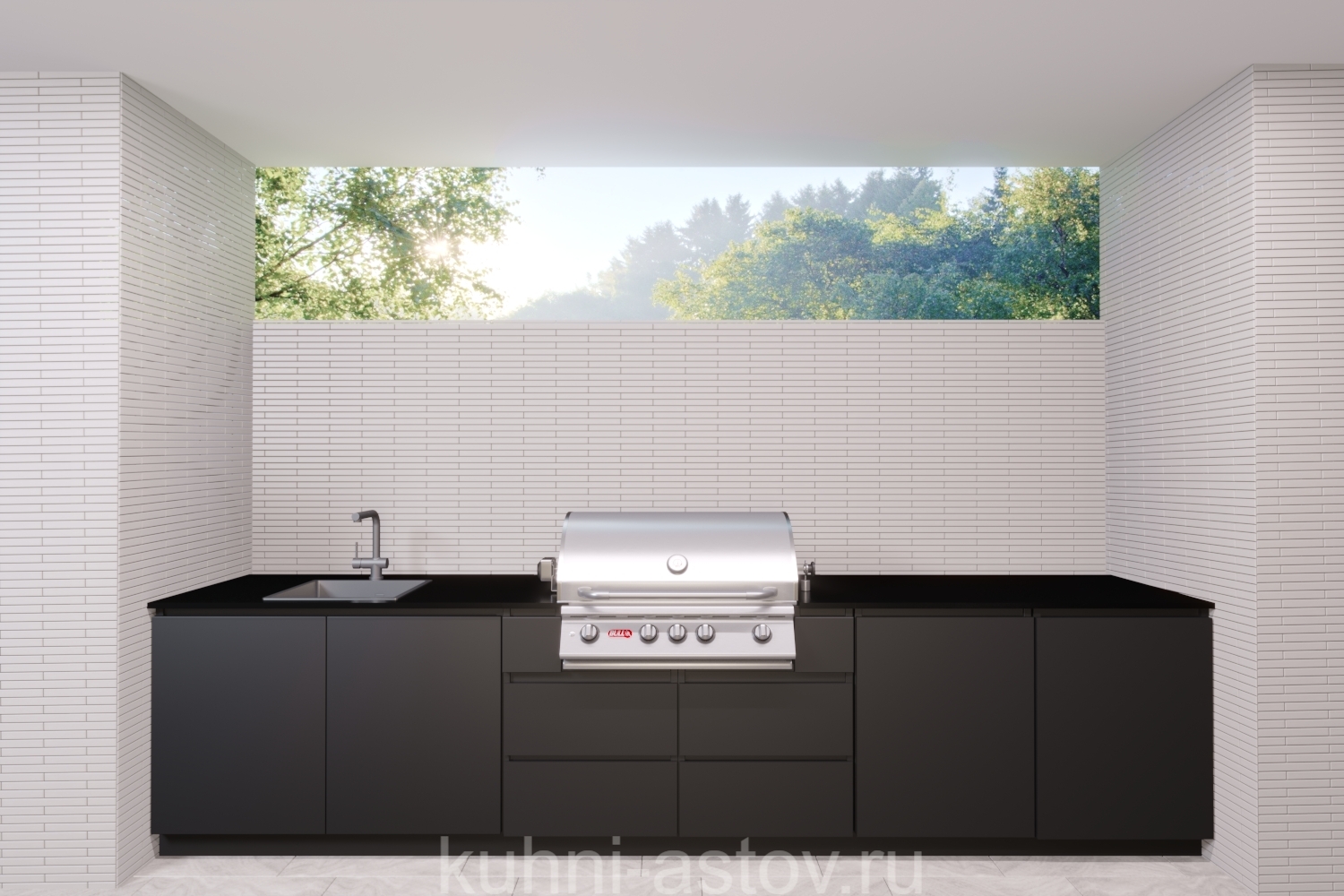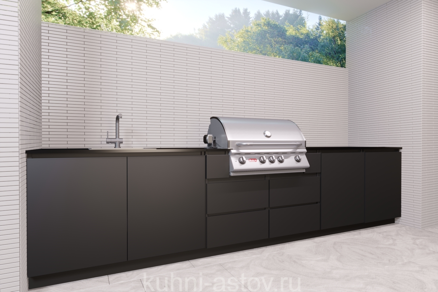 Фасады кухни 2х-контурные внутри имеют специальный слой шумоизоляции. Столешница изготовлена из натурального камня (гранит Absolut Black), толщиной 20 мм. Надежные мойка и смеситель японского производителя (бренд Omoikiri). Много места для хранения. Если вы любите готовить на углях – вы, конечно же, можете заменить газовый гриль на угольный мангал производства компании Астов. Для своей идеальной <a title="зоны барбекю из металла" href="/product-category/zony-barbekju/">зоны барбекю из металла</a> вы можете выбрать любые предпочитаемые приборы в нашем каталоге оборудования.