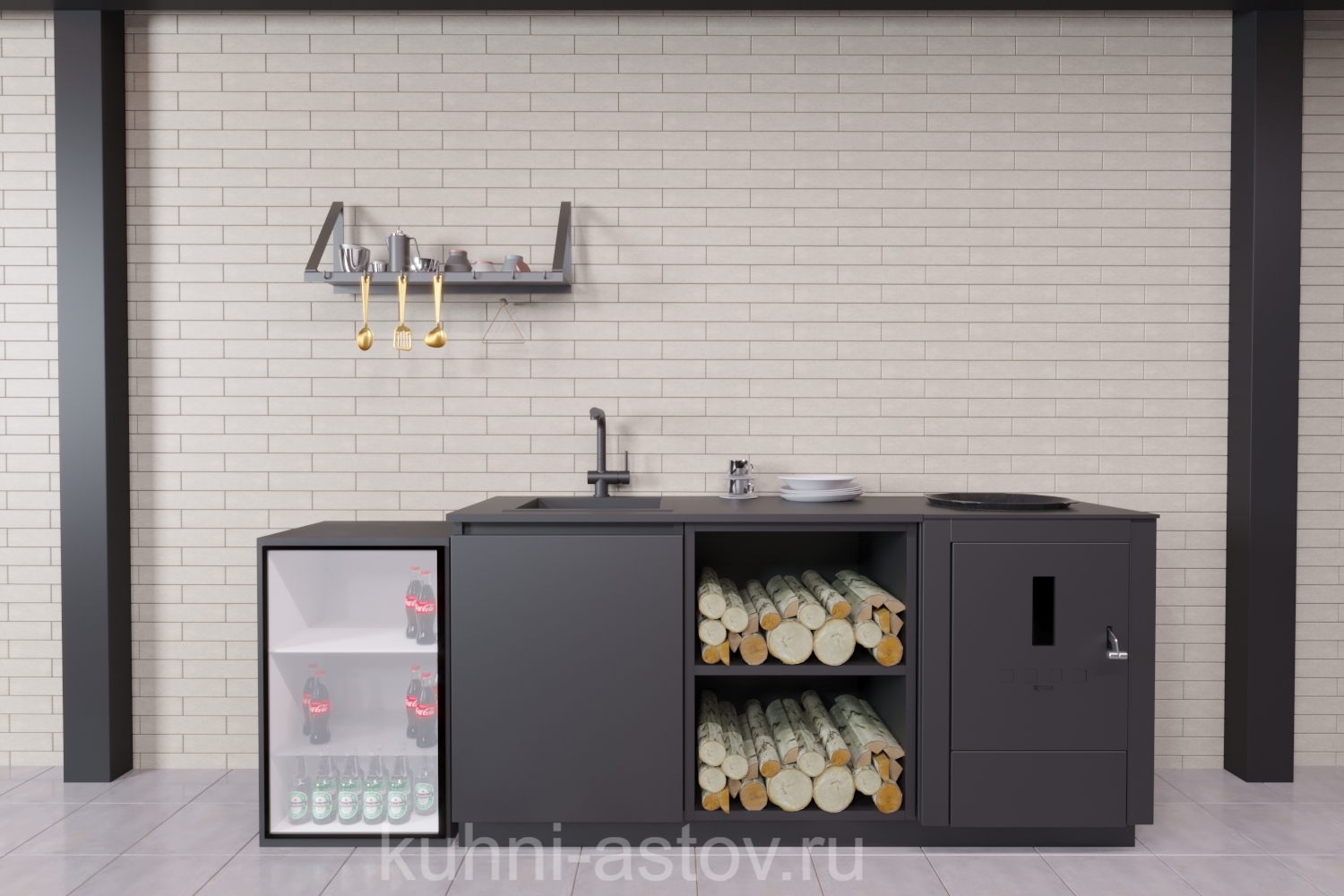 Изготовление корпуса и фасадов из качественной оцинкованной стали толщиной 1 мм, устойчивой к воздействию внешних факторов, обеспечит длительную эксплуатацию. 2-контурные фасады, так же как и корпуса тумб, защищены порошковым покрытием цвета RAL9005, что подчеркивает брутальность этой <a title="зоны барбекю на даче" href="/product-category/zony-barbekju/">зоны барбекю на даче</a>. В качестве дополнения можно установить угольный гриль. Так же вам обязательно надо выбрать и добавить столешницу, мойку и смеситель.